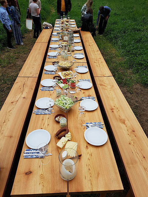 Vor allem im Sommer können Einheimische und Ausflügler hier Kaffee und Kuchen in schönster Idylle genießen: Vom Hof führt ein 1870 erbauter kurzer Tunnel in ein kleines Tal mit einer Streuobstwiese. Zwischen uralten, knorrigen und jungen, kleinen Bäumen steht eine Tafel, die 30 Personen Platz bietet. „Es ist ein magischer Ort, der sehr viel Emotionalität ausstrahlt“, schwärmt Scheffel. „Hier können unsere Gäste zur Ruhe kommen, die Stille genießen und neue Energie tanken.“