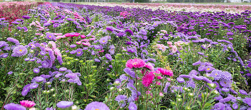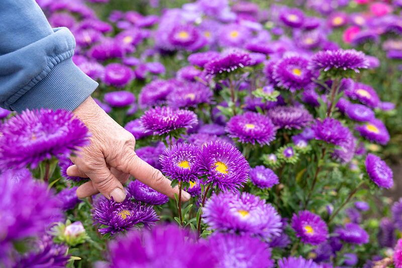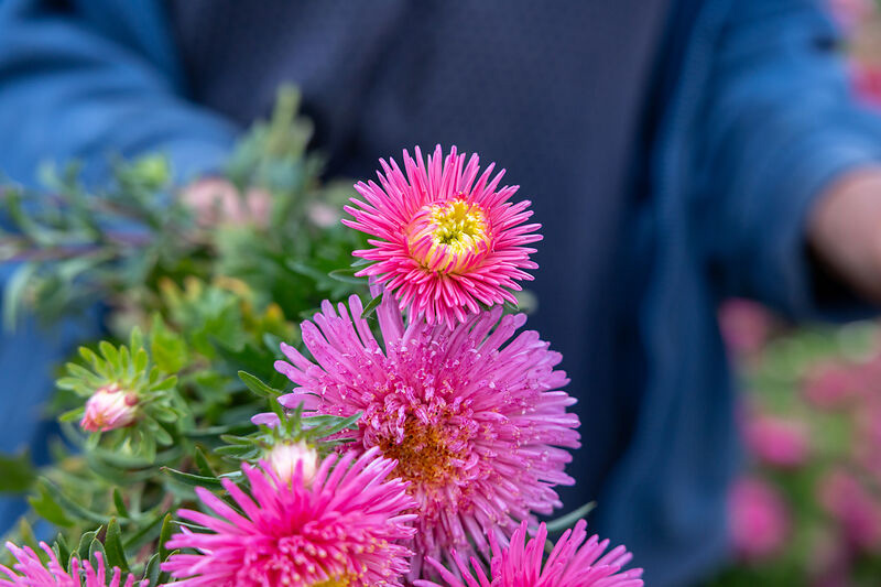 Ein besonderes Beispiel für Astern sind die sogenannten Lilo-Astern, die in Erfurt von Edith Bayer gezüchtet wurden. „Lilo-Astern zeichnen sich dadurch aus, dass sie ihre klare gelbe Mitte zeigen und dadurch einen schönen Farb-Zweiklang bringen. Das ist ihr Sortenerkennungszeichen“, erzählt Rose und zeigt uns eine der Astern, die es deutlich macht: Die gelbe Mitte bildet einen schönen Kontrast zu den unterschiedlichen Blütenfarben – dunkelviolett, hellblau, rot, rosa, weiß.