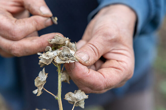 Neben klassischen Kulturpflanzen spielen Wildpflanzen eine immer größere Rolle. Die Moschus-Malve etwa ist eine heimische Art aus Thüringen und Bestandteil regionaler Saatgutmischungen. Ihre Samen sind klein, schwarz und pelzig – jeder sieht ein wenig anders aus.
