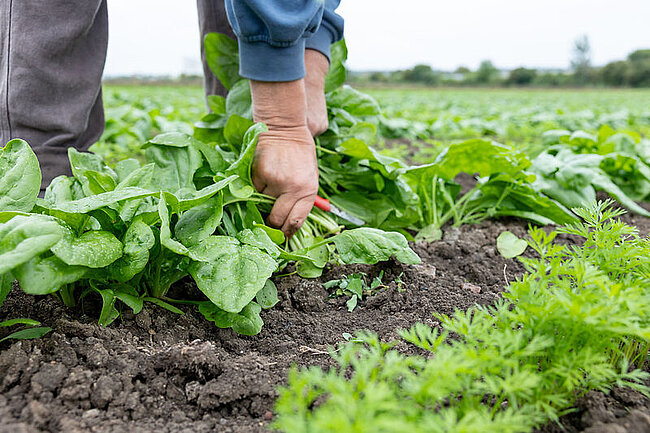 Wenn Annegret Rose durch ihre Felder streicht und auf den ersten Blick Pflanzen von Beikraut unterscheiden kann, merkt man sofort, dass hier die Erfahrung aus ihr spricht. Die Kulturpflanzen stehen sauber in der Reihe, mit gleichmäßigen Abständen von etwa 18 bis 30 Zentimetern. „Dann sieht man alle 20 Zentimeter die gleiche Pflanze wieder“, erklärt sie lachend.